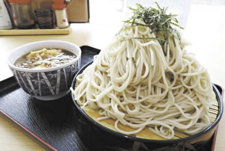 大多数外来食客的目标并非可口的套餐或盖饭,而是分量惊人的特制荞麦面。食堂的荞麦面还有凉面和热面,只有特制荞麦面有多种规格:特、中特以及大特,价格分别是650日元、700日元和800日元。菜单上特别展示了不同规格荞麦面的照片,其中“大特”旁明确注明:“分量满满,约1公斤!”即便空着肚子来,看到菜单照片和其他桌上小山一样的面条,也要慎重考虑一下自己的“肚量”。据说食堂之前只卖特和大特两种规格,后来为了满足普通人的需求,才推出介于两者之间的中特。